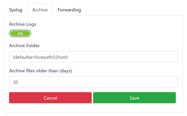 Fastvue Syslog Server automatically zips logs older than 30 days (configurable) and moves them to an archive folder, reducing disk space requirements.